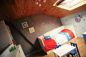 Charly était tout content de découvrir sa chambre, même si les premières nuits ont été un peu difficile à mettre en place, au bout de quelques jours, il a fini par s’y endormir aussi vite que dans sa « chambre de bébé »… La pluie sur le vélux lui fait un peu peur encore et il m’a déjà fait une escapade par dessus la barrière de sécurité de la chambre… Le plus difficile a été l’attaque sur les jolis stickers que papa et maman avaient collés avec amour… Mais bon, il n’a pas deux ans et demi… Il parait que moi aussi j’avais massacré le joli circuit de Spa Francorchamps que mon papa avait dessiné avec amour et collé au dessus de mon lit au même âge…