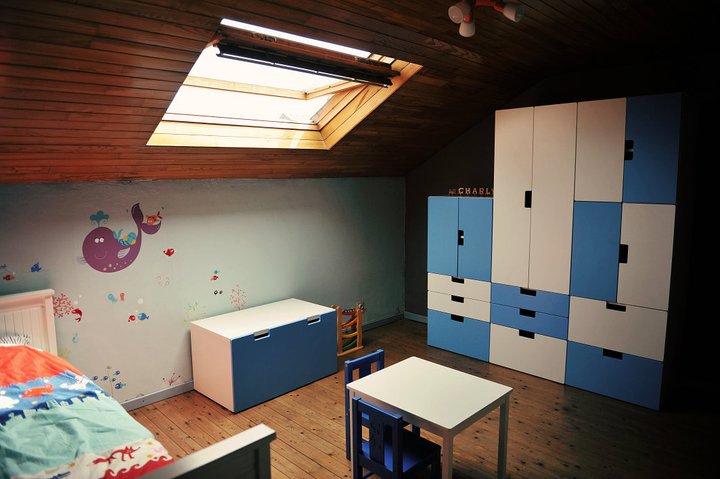 Voilà, voilà… les vacances sont finies, et hormis une petite trêve au soleil, elles furent 100% consacré à l’organisation de la maison pour l’arrivée des Miss. Il fallait une chambre plus, comme je vous en avais parlé, nous avons donc transformé la cave en zone Underground, puis après de nombreuses visites chez Ikea et son stock foireux, je me suis à faire la chambre de grand de Charly. Planché reverni, mur replafonné, peinture rafraichie, meubles construits, nouveau luminaire, jolis stickers poissons… Ouf, on y est arrivé !
