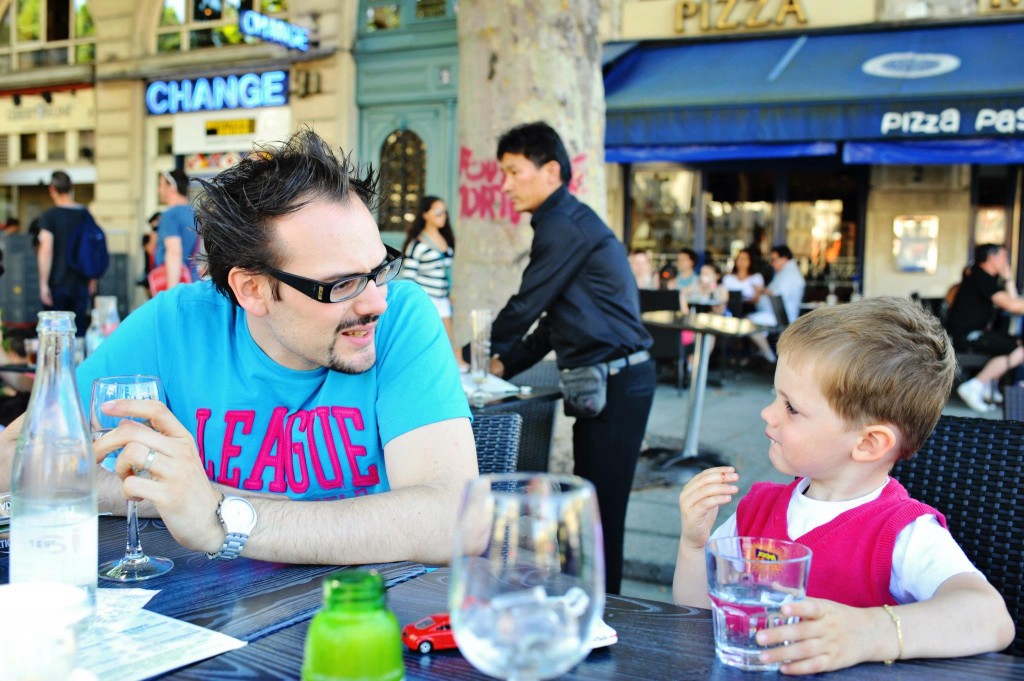 Voilà déjà une sacrée balade qui n’est pourtant qu’un tout petit bout de notre trip à pied dans la ville, mais déjà un constat se place et que je craignais un peu… cela ne va pas être coton pour faire des photos. Tout d’abord, nous sommes entourés en permanence de dizaines et dizaines de touristes, et tenter de jolies mise en scène LifeStyle dans Paris semble donc totalement impossible sans s’y promener à 6h du matin ! C’est peut-être bien le secret des photographes locaux… Il nous faudra donc prendre ce paramètre en compte, avec un petit garçon à tenir d’une main, une poussette, un gros sac à dos… et les bons kilos du D700 autour du coup. Bref, de quoi remettre au retour à l’étude le choix d’un APN performant et moins encombrant… Sony NEX 7, Fujifilm X100 ou X-Pro 1 ?