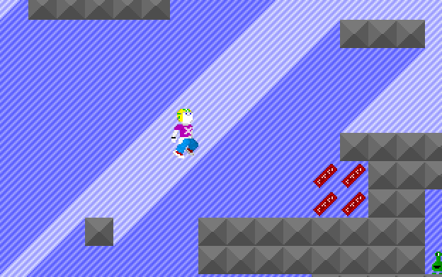 Enfin, que serait Commander Keen sans la pratique du Pogo ? Si si, vous savez ce genre de bâton sur ressort qui sert à sauter plus haut. Au bout de quelques niveaux de ce premier épisode, Billy découvre dans une station martienne, un pogo qui va lui permettre d’effectuer des sauts impressionnants, mais également d’assommer des ennemis. Il faudra alors habilement jongler avec les CTRL, ALT et SPACE du clavier… à moins d’avoir fait l’acquisition du précieux JoyPad Gravis.