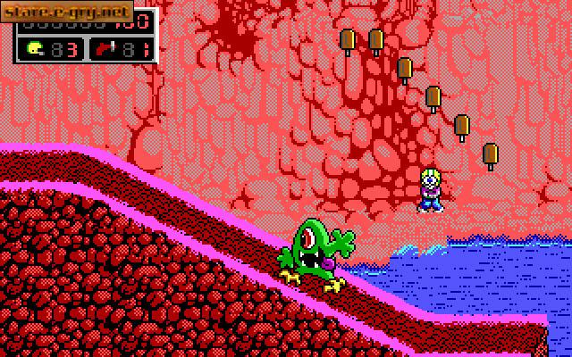 C’est toujours durant l’année 1992 que je découvrirai ce cultissime Keen 4. Graphiquement le jeu tourne toujours en 16 couleurs, alors que de nombreux titres PCs sont maintenant produits en VGA 256 couleurs, quoique pour l’époque le résultat graphique reste sublime. Le sprite de notre héros Billy et les ennemis sont beaucoup plus grands et les étapes d’animations nombreuses. Coté maniabilité, on peut désormais s’accrocher au bord des murs en faisant une petite roulade, regarder en haut et en bas pour se prévenir du danger, ainsi que sauter en tirant vers le haut ou vers le bas.