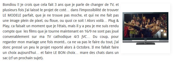 Ma super TV HD Sony Bravia achetée en 2008, on peut dire qu’elle a réussi sont test de longévité, d’autant qu’elle aura été bien malmenée par les petits loulous ! Fidèle dans la qualité d’image tant en HD qu’en Simple Définition, peu ou pas de modèles actuels s’inquiètent de restituer une image propre d’un signal SD. Son défaut principale étant depuis déjà quelques années une lenteur anormal apparue lorsque je l’allume avant que la télécommande ne soit reconnue. 3 prises HDMi, 3 SCART et une numérique couplé à un port USB permettant de lire des photos, pour l’époque, c’était le nec plus ultra en 81cm. Et c’est peut-être ce qui lui fait le plus défaut maintenant que mon salon est plus long… L’image est un peu trop petite, essentiellement lorsqu’il faut lire des sous-titres à l’écran.