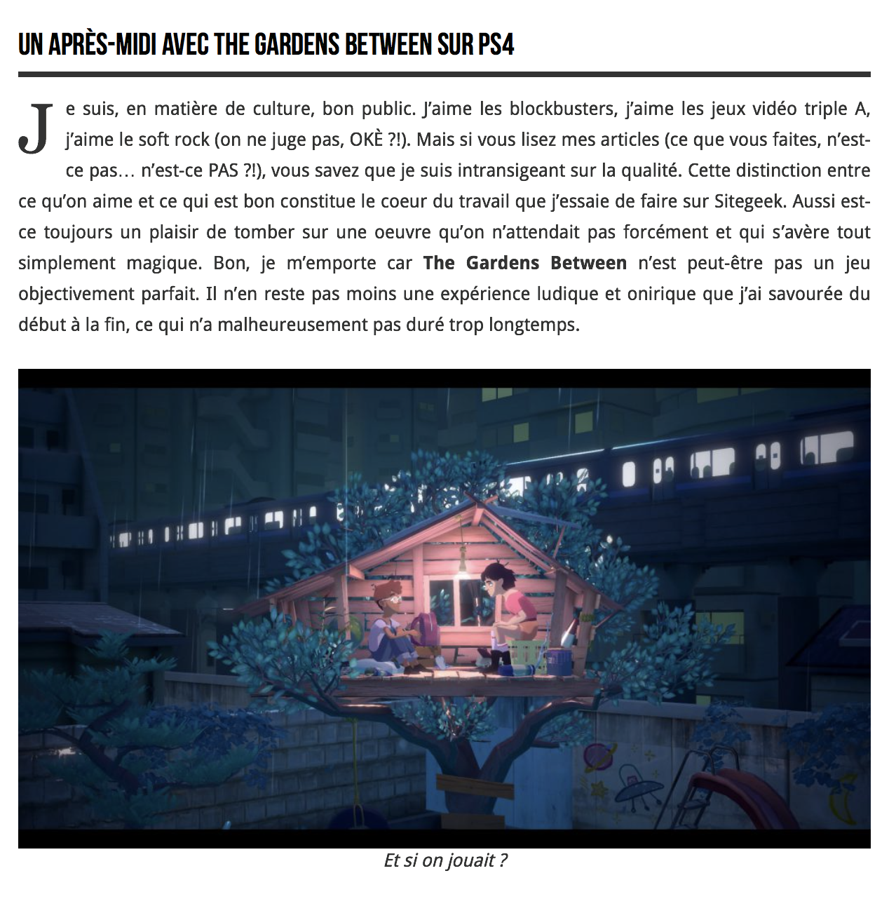 C’est bien simple, The Gardens Between est l’une des expériences les plus rafraîchissantes que j’ai pu vivre sur ma console dernièrement (avec Oxenfree… histoire de faire de la pub à un autre bon jeu indé !). Je troquerais volontiers 10 triple A pour une poignée d’autres titres de cette trempe, qui suintent l’amour de ses concepteurs, avec une vision originale et une maîtrise tant artistique que mécanique de leur bébé. Tout au plus pourra-t-on reprocher à The Voxel Agents de nous laisser sur notre faim avec un jeu un brin trop court et une difficulté qui risque de paraître un peu basse pour les adeptes du genre. En tout cas, si soutenir un studio indé vous tient plus à coeur que d’enrichir des grosses boîtes désincarnées, The Gardens Between est certainement un excellent choix. (Un test à lire sur Sitegeek.fr)