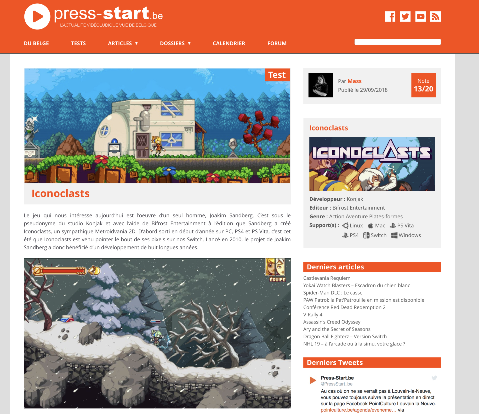 Le jeu qui nous intéresse aujourd’hui est l’oeuvre d’un seul homme, Joakim Sandberg. C’est sous le pseudonyme du studio Konjak et avec l’aide de Bifrost Entertainment à l’édition que Sandberg a créé Iconoclasts, un sympathique Metroidvania 2D. D’abord sorti en début d’année sur PC, PS4 et PS Vita, c’est cet été que Iconoclasts est venu pointer le bout de ses pixels sur nos Switch. Lancé en 2010, le projet de Joakim Sandberg a donc bénéficié d’un développement de huit longues années. En sachant qu’il s’agit là du travail d’un unique développeur, Iconoclasts force le respect. Son gameplay est rodé et on sent que l’ami Joakim ne s’est pas lancé à l’aveugle dans son Metroidvania. Le level design est intelligent, avec juste ce qu’il faut de backtracking, et les méandres de ses labyrinthes sont toujours bien pensés…. (Un test à lire sur Press-Start)
