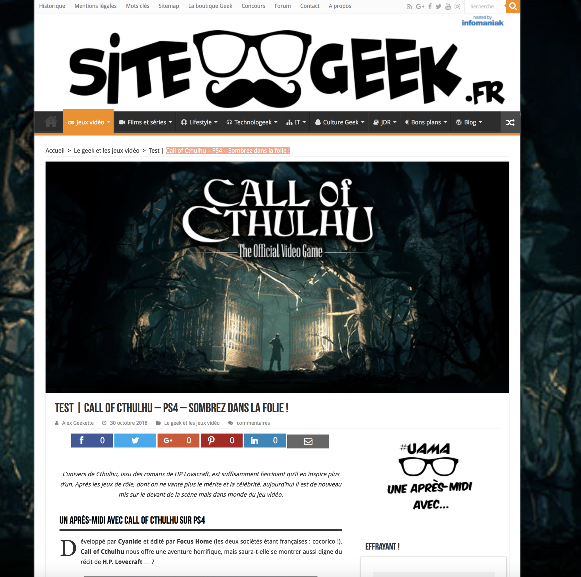 Comme beaucoup, j’ai connu Cthulhu à travers les jeux de rôle et j’en ai appris d’avantage sur son univers via les romans de Lovecraft. J’ai beaucoup d’appréhension lorsque je teste un jeu dérivé d’une oeuvre existante car les comparaisons sont souvent délicates. Suite à ce test je suis prête à affirmer que non seulement l’oeuvre est respectée, mais en plus l’univers en est sublimé ! Toutes les sensations que je peux ressentir lorsque je suis autour d’une table de jdr sont ici parfaitement retranscrites : scènes horrifiques, ambiance oppressante, enquête étouffante… Jusqu’à sombrer progressivement vers la folie, jusqu’à douter de ses alliés et de soi-même ! (Un article à lire sur Sitegeek.fr)