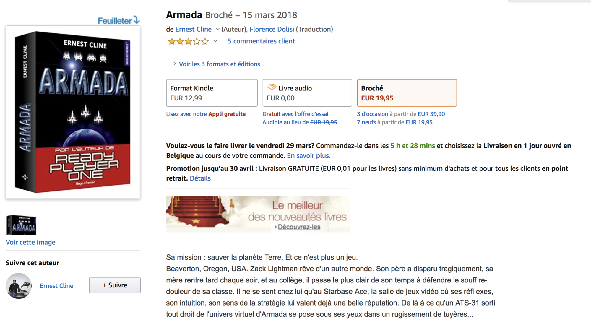 Alors que Ready Player One se retrouvait même porté sur le grand écran, j’attendais patiemment que son nouveau roman Armada ne soit traduit en français, ce qui semblerait « enfin » le cas depuis l’année dernière. Néanmoins, alors que j’avais un moment envisagé le lire en anglais le roman de celui qui était devenu l’ambassadeur de la culture pop outre-atlantique, les critiques sur ce nouveau roman semblaient de plus en plus en faire un bon scénario de film d’action plutôt qu’un bon roman… Au fond, le pitch assez proche de « La Stratégie Ender » n’avait pas vraiment non plus réussi à me convaincre totalement.