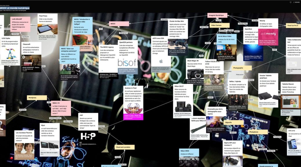 J’ai choisi pour ce padlet d’utiliser un mode « libre » qui permet de relier certaines contenus entre eux et des rassembler. Ce qui me permettra à terme de plus facilement sélectionner des groupes de contenus pour en faire des articles plus complets.