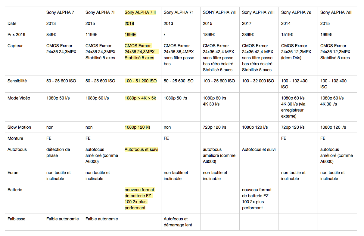 Dans une gamme Sony Alpha 7 trop vaste, il n’est simple de savoir ce que chacun des boitiers à comme caractéristiques et différences. Même en magasin, je n’ai pour l’heure pas réussi à pouvoir obtenir des renseignements précis, je me suis donc fait un petit mémo puisque l’on retrouve encore aujourd’hui sur le marché l’Alpha 7, l’Alpha 7II, l’Alpha 7III, l’Alpha 7r, l’Alpha 7rII, l’Alpha 7rIII, l’Alpha 7s et l’Alpha 7sII avec des prix allant de 850 à près de 3000€.