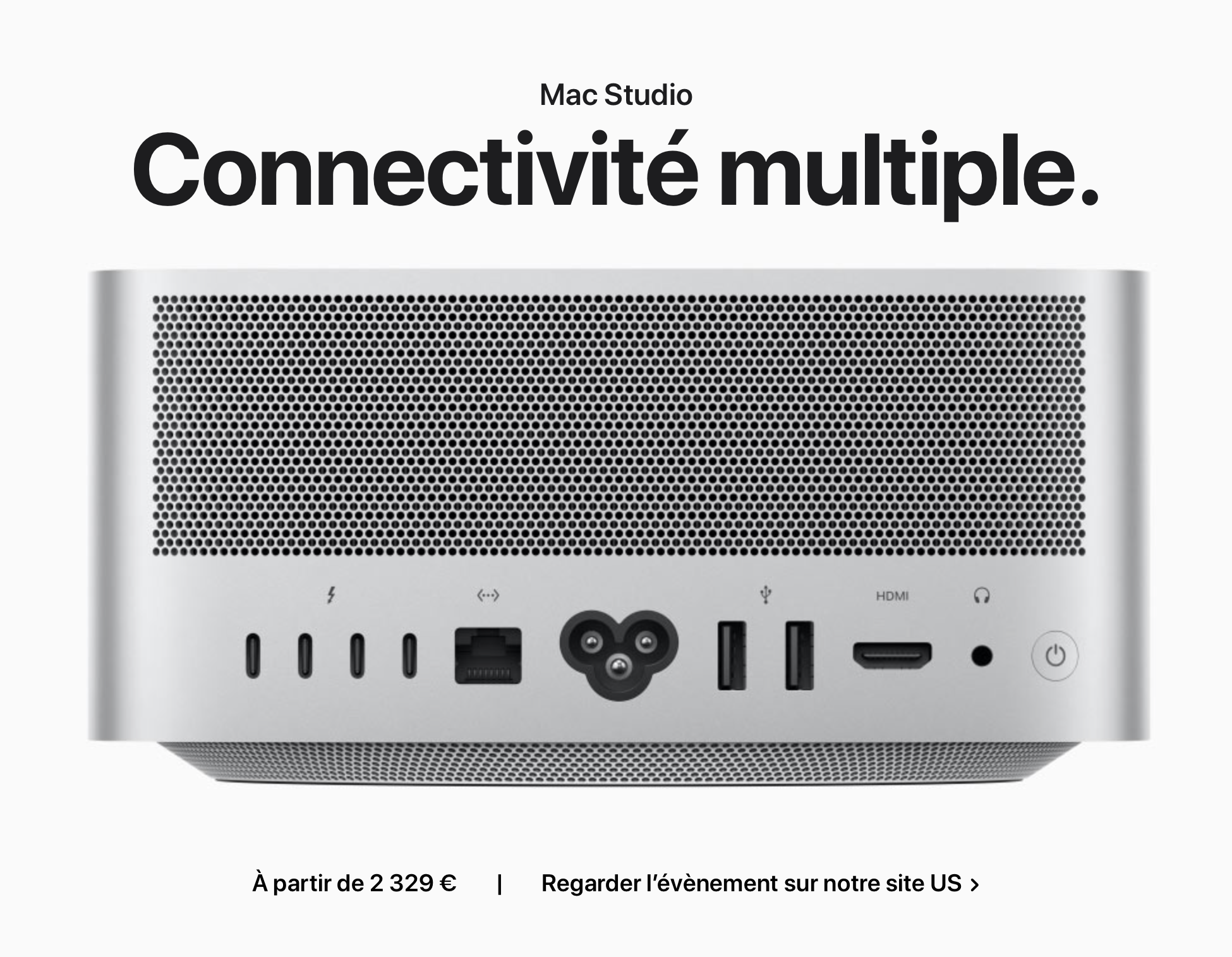 Les approches réductrices d’Apple me faisaient craindre un strict minimum côté connectivité ! Il n’en est rien, le MAC Studio propose 2 ports USB-C/Thunderbold 4 et un port SD en façade et 4 ports USB-C/Thunderbold 4, 1 port HDMi, 1 port Ethernet et 2 ports USB 3 à l’ancienne. Soit rien de moins que ce que proposait l’iMac Pro !
