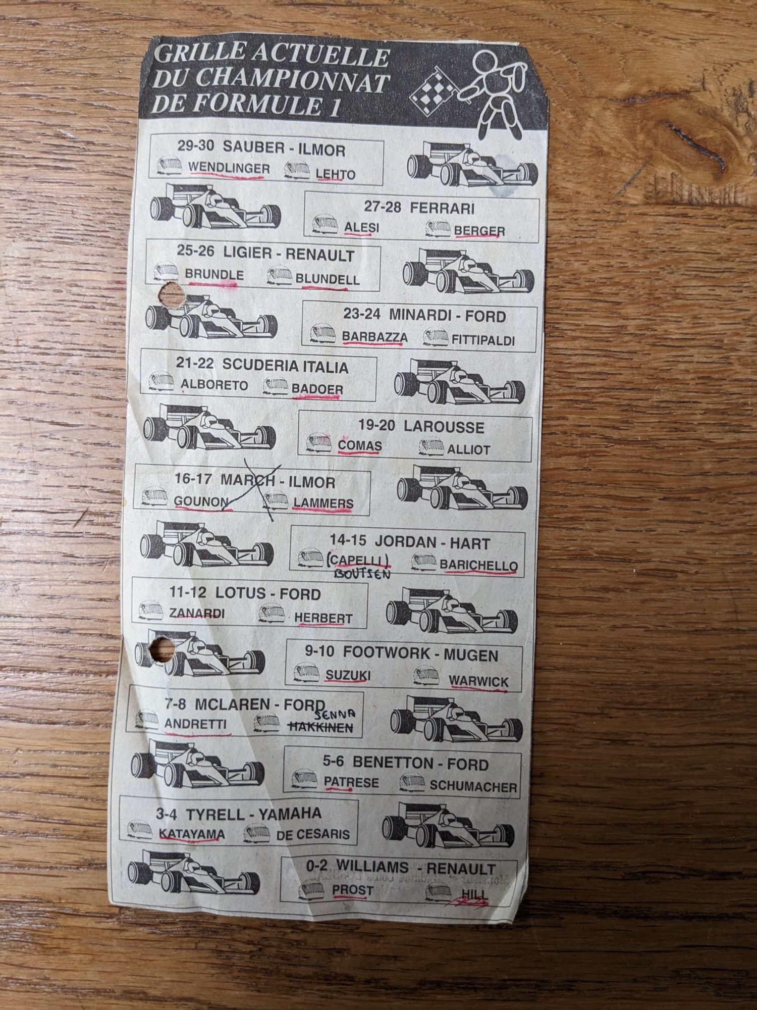 Puis il y a ce souvenir tout particulier. Ce petit bout de journal que je garde maintenant depuis 30 ans dans ma table de nuit et qui reprend les écuries et pilotes annoncées pour la saison 1993. Tout n’y est pas totalement correct, puisque certains changements arriveront avant le premier GP.