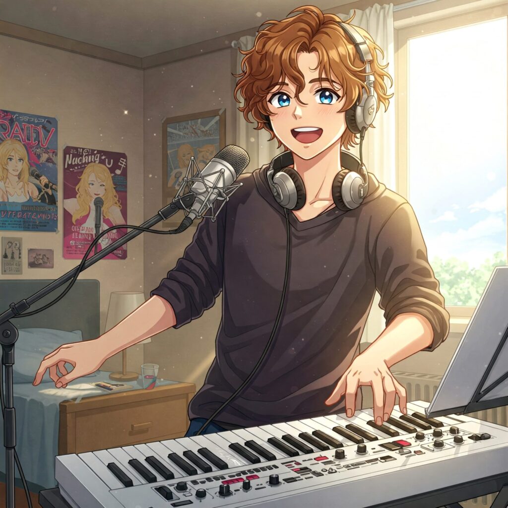 Quelques jours plus tard, je me suis ensuite penché sur une illustration similaire pour mon grand Charly, en mode chanteur sur son piano. De quoi m’arracher les cheveux avec des positions incongrues, des pianos à l’envers et pour je ne sais quelle raison, une volonté caractériel de Gemini à ajouter des piercings !!