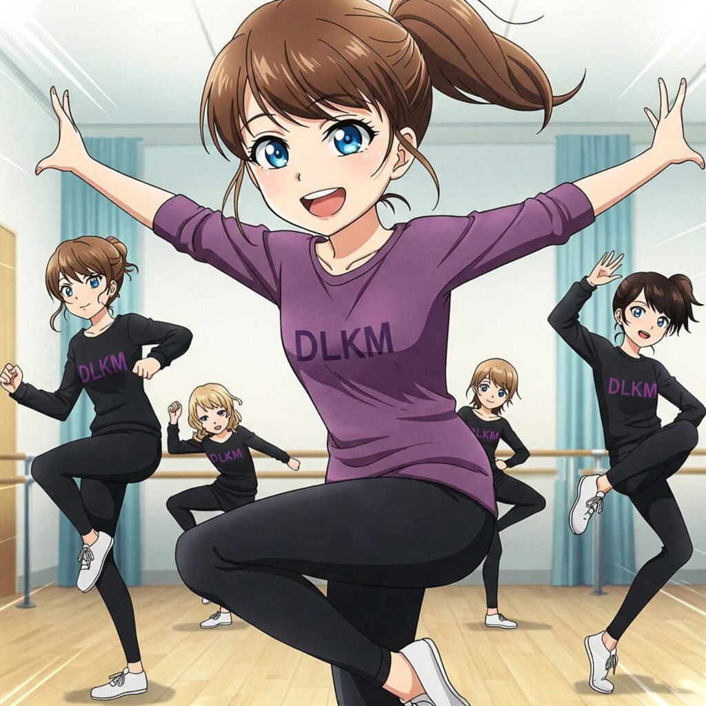 J’aimerais une illustration en style manga anime de Juliette, 13 ans, en pleine performance de danse modern jazz. Elle doit exécuter un saut spectaculaire, comme un grand jeté ou un split leap, sur scène. Elle est entourée de 4-5 autres danseuses du même âge en arrière-plan. Toutes portent une tenue noire avec « DLKM » en mauve. L’ambiance doit être dynamique, lumineuse et pleine d’énergie. ✨