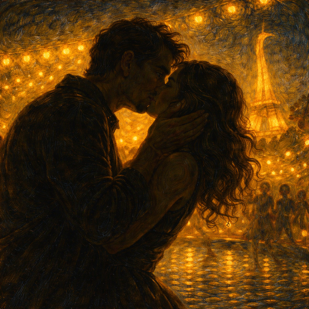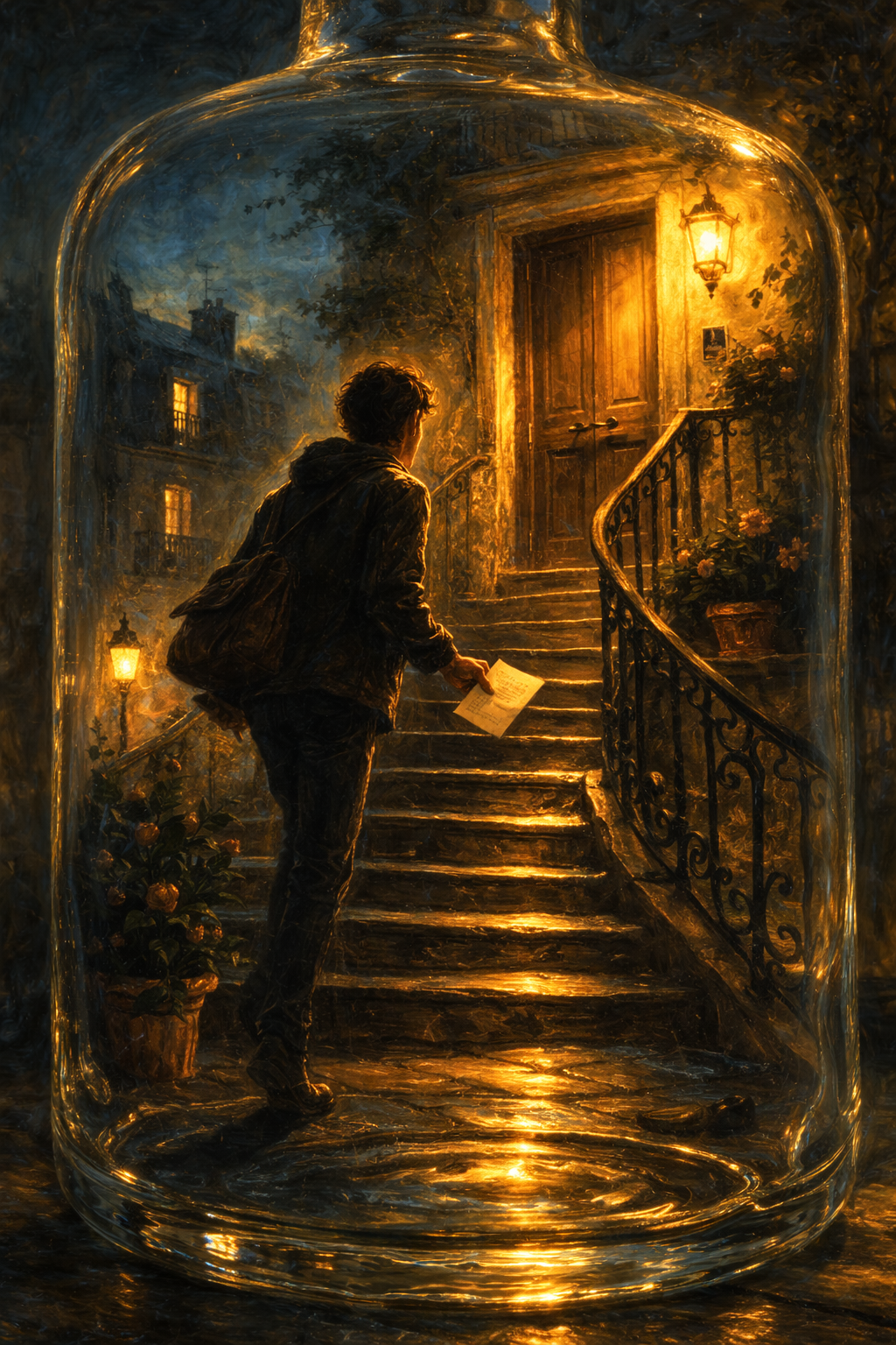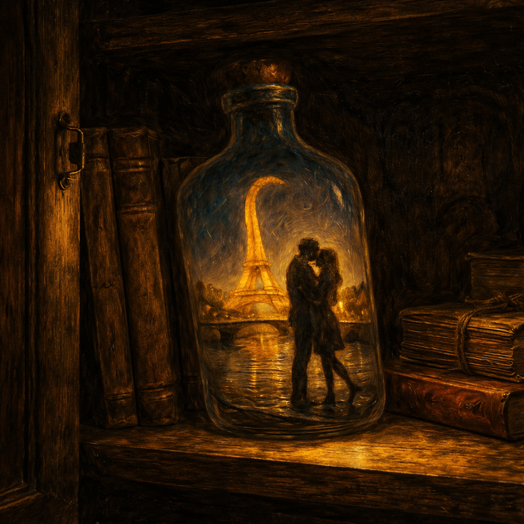 En septembre, jonglant entre ChatGP et Gemini pendant quelques jours, j’avais réussi à trouver cet ambiance, cette univers, ces petits détails qui visuellement allait illustrer la pochette du single. Ce coté lumineux, peinture à l’huile, ombre, un Paris qui se plie dans une bouteille… Pas juste 3 commandes envoyées à l’IA. La sensation de la guider vers ce qui se construit dans mon esprit… M’ouvrant la porte à de nouvelle idées.