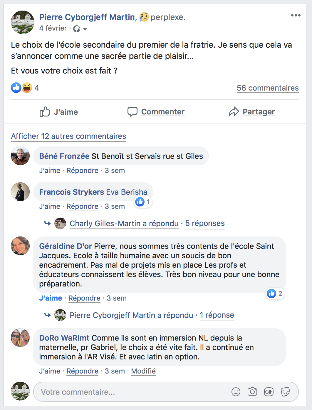 Enfin, j’ai envie de lui trouver une école où il rencontrera des enseignants motivés, qui lui donneront de pouvoir apprendre de manière innovante, avec le numérique comme le fait Laurent Di Pasquale à l’Air Pur ou Gaël Gilson à l’Athénée de Chênée, mais également un apprentissage où il pourra créer, expérimenter, découvrir…