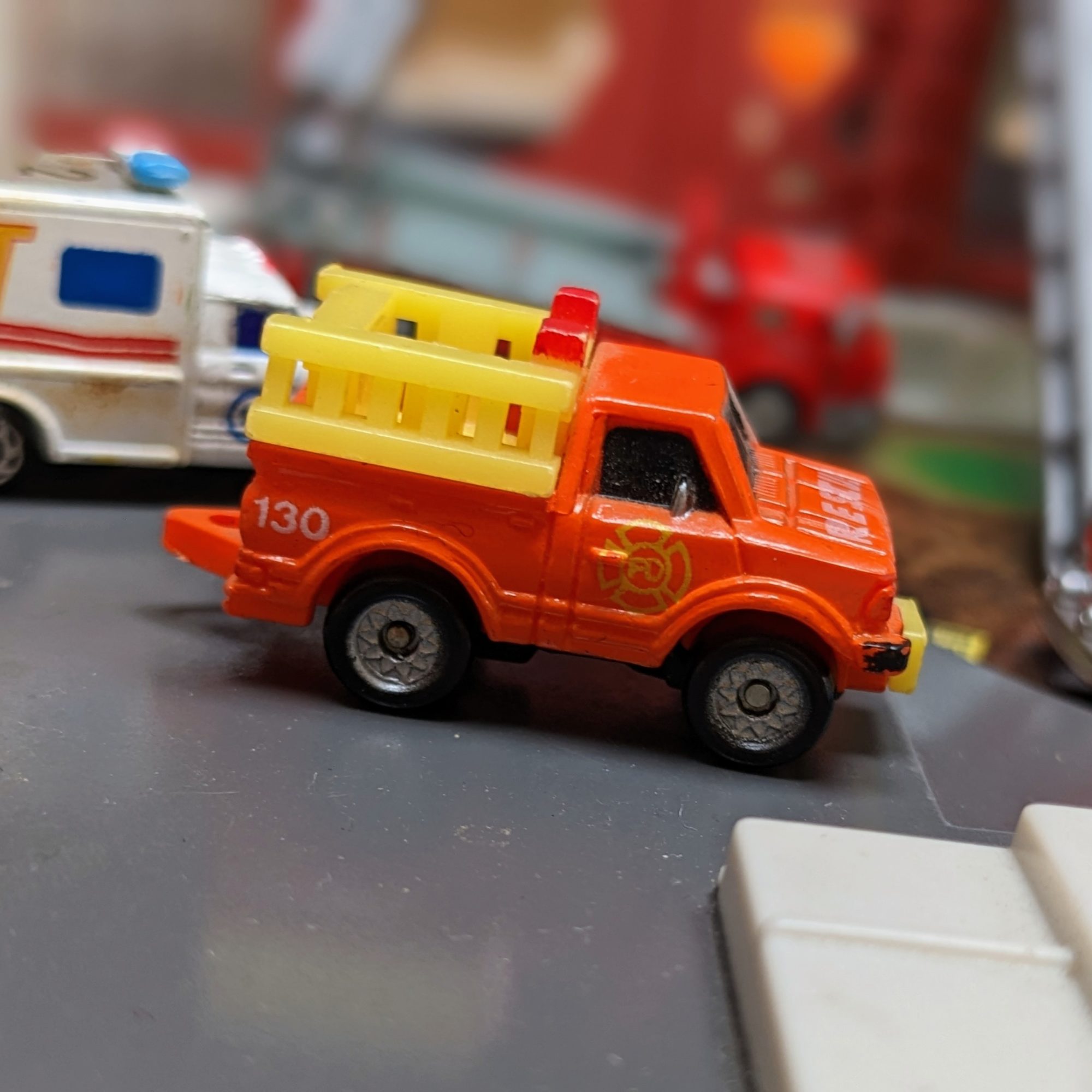 J’ai récemment acquis une série de modèle issus de Funrise qui sortent de l’ordinaire. J’avais déjà beaucoup de clones de voitures classiques de cette marque. Leur qualité est un cran en dessous des Micro Machines de Galoob mais l’approche est suffisamment ressemblante que pour tromper l’oeil. Ici encore, véhicules de pompier, bulldozers et autres camions à benne sont plutôt réussis et ne déméritent pas !