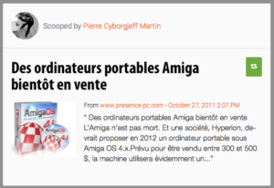 « Des ordinateurs portables Amiga bientôt en vente L’Amiga n’est pas mort. Et une société, Hyperion, devrait proposer en 2012 un ordinateur portable sous Amiga OS 4.x.Prévu pour être vendu entre 300 et 500 $, la machine utilisera évidemment un… » (A lire : Des ordinateurs portables Amiga bientôt en vente)