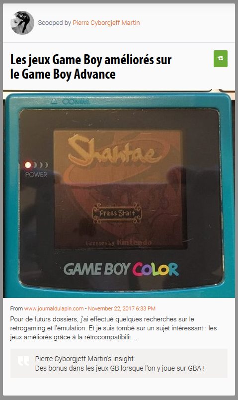Petite surprise Le Journal du Lapin se penche sur l’amélioration des jeux GB Color sur une GB Advance dans une belle analyse mettant en avant notamment l’excellent (mais impayable) premier épisode de Shantae mais également Wendy Every Witch Way qui vient de rentrer dans ma collection !